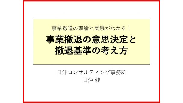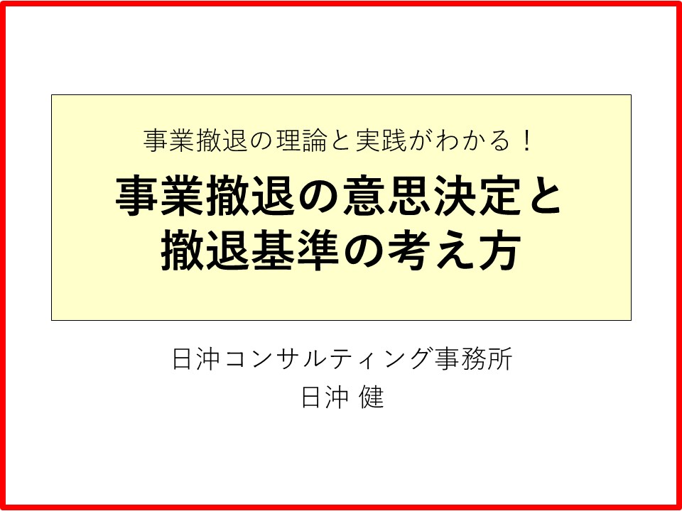 企業が長期的に成長・発展するためには、不採算で将来性がない事業から撤退し、経営資源を成長分野に振り向ける必要があります。ただ、なかなか事業撤退を意思決定できない企業が多いようです。このセミナーでは、『戦略的事業撤退の実務』の著者が、事業撤退の考え方や意思決定の進め方、撤退基準の作り方・運用方法などを、自身のコンサルティング事例を交えて実践的に解説します。