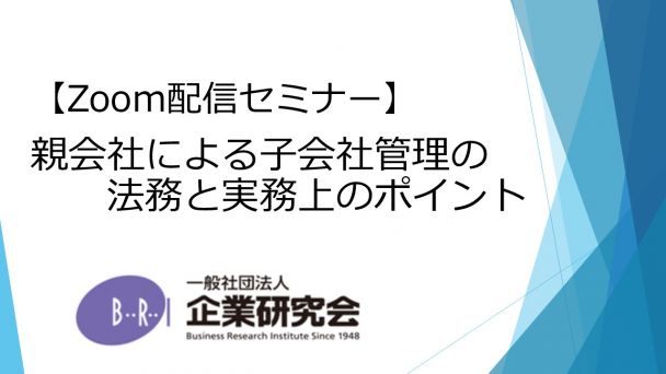 【開催にあたって】 持株会社化やグループ経営の進展に伴い、子会社において発生した不祥事が親会社やグループ全体に対して重大な悪影響を及ぼす可能性が生じており、子会社管理の重要性がますます高まっています。 もっとも、親会社として子会社をいかに管理すべきかは、実務上悩ましい点も少なくありません。 この点については、コーポレート・ガバナンス・システム研究会での議論を踏まえて経済産業省が2019年6月に策定した「グループ・ガバナンス・システムに関する実務指針」が参考になります。 そこで、本セミナーでは、同研究会の委員を務めた講師が、上記実務指針や実際の子会社の不祥事事例も踏まえながら、親会社による子会社管理の法務と実務上のポイントについて解説いたします。