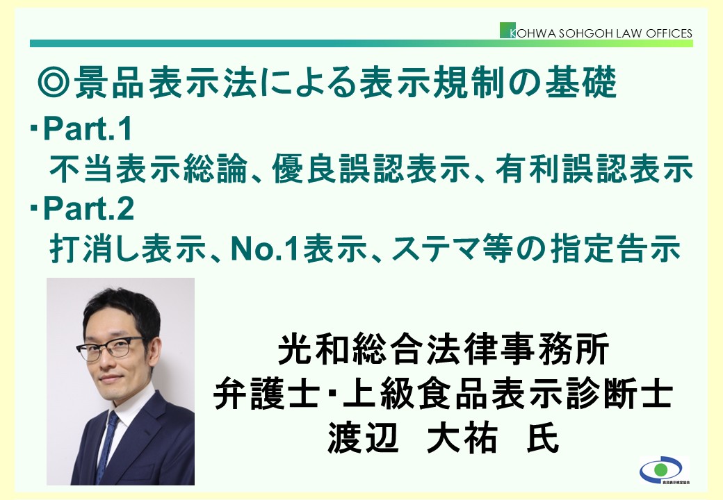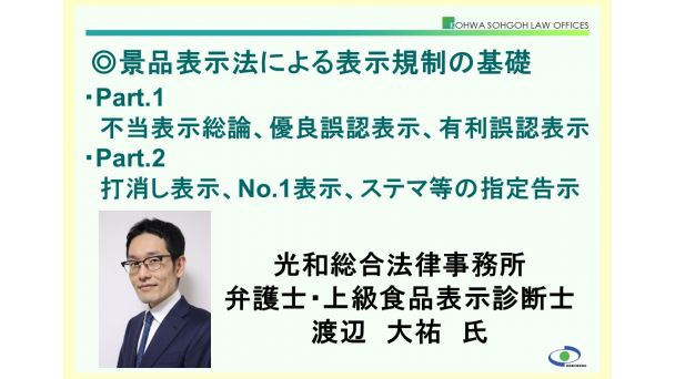 渡辺大祐先生をお迎えし「景品表示法による表示規制の基礎」について、基礎から講義していただきます。
