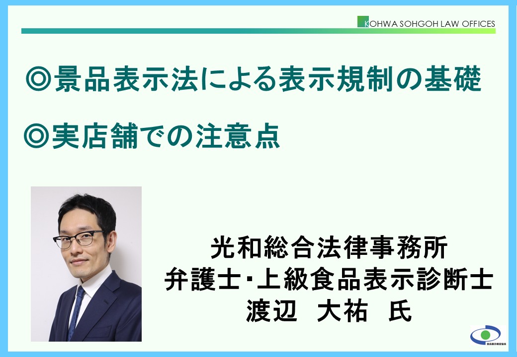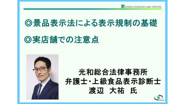 渡辺大祐先生をお迎えし「景品表示法による表示規制の基礎」と「実店舗での注意点」について、講義していただきます。