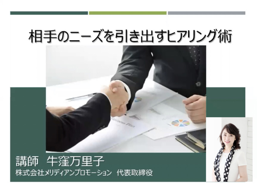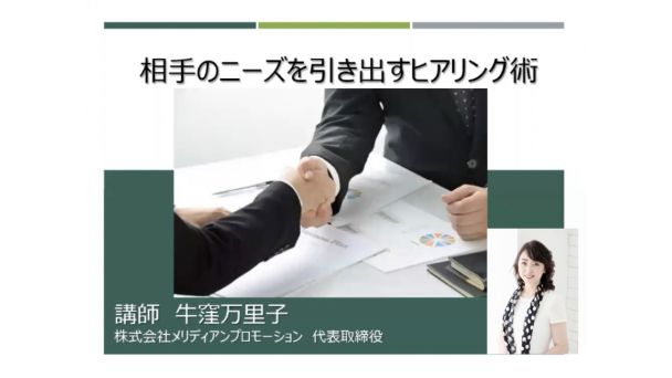 元NHKキャスター牛窪万里子がテレビ取材のインタビューで培ったオリジナルヒアリングメソッド「油田堀®」(商標登録済)の聞き方とタイプ別に合わせた影響言語を紹介する特別プログラム。およそ1時間に凝縮した内容。相手のニーズを知るためのヒアリング力を強化するためのポイントについて学ぶことができます。