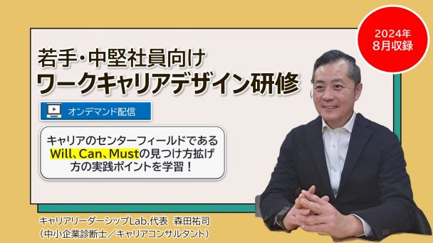 キャリアのセンターフィールドであるWill、Can、Mustの見つけ方、拡げ方の実践ポイントを学習し、個人と組織が共によくなるためのキャリアデザインの実現に向け、第一歩を踏み出せるようになっていることがゴールです。