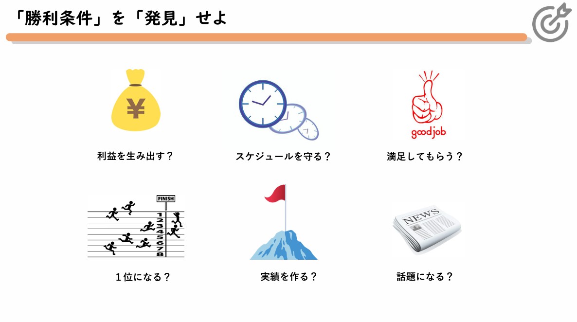 この講座では、プロジェクトの成功に必要な「勝利条件」を発見し、達成するための戦略的思考術を履修します。