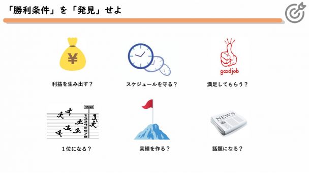 この講座では、プロジェクトの成功に必要な「勝利条件」を発見し、達成するための戦略的思考術を履修します。