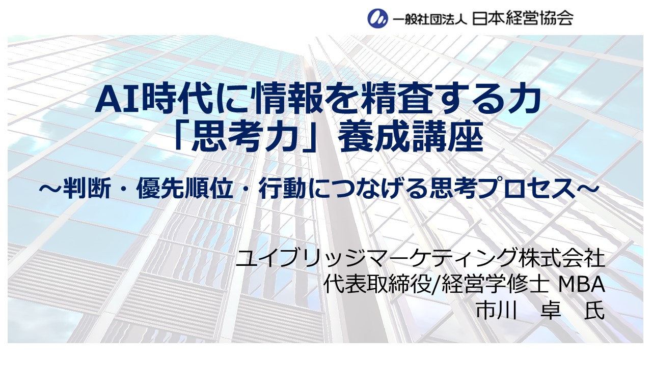 AI活用によって整理された情報を瞬時に入手することができるようになった今、ビジネスパーソンに求められていることは「思考力」です。複雑多様な情報を「どう解釈し、どう判断し、どんな一手に落とすか」までを適切に導く力を鍛える講座を開講します。
