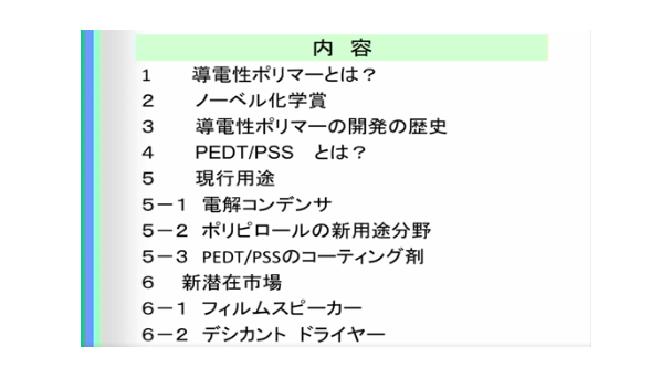 元・バイエルで1995年から2007年までPDOTの市場開発を担当。現職では、塗料・インキの添加剤開発を手掛ける。